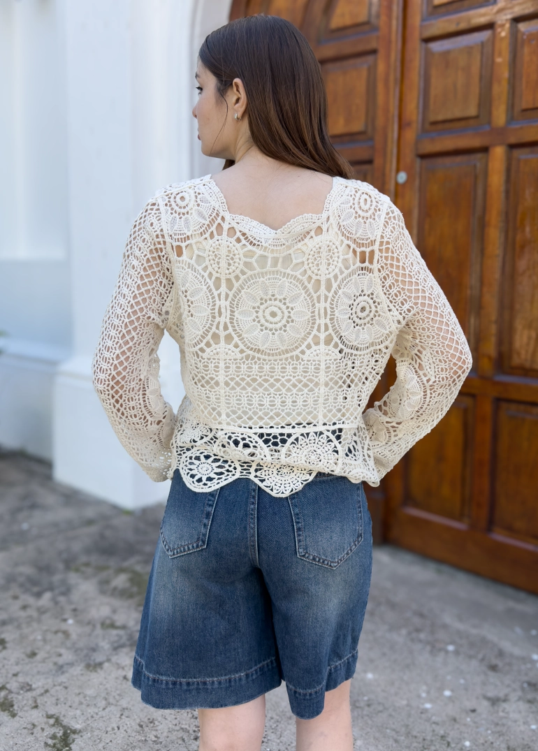 Blusa tejida en crochet. Con musculosa básica y cinto. Mangas largas oxford.