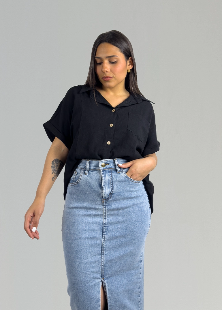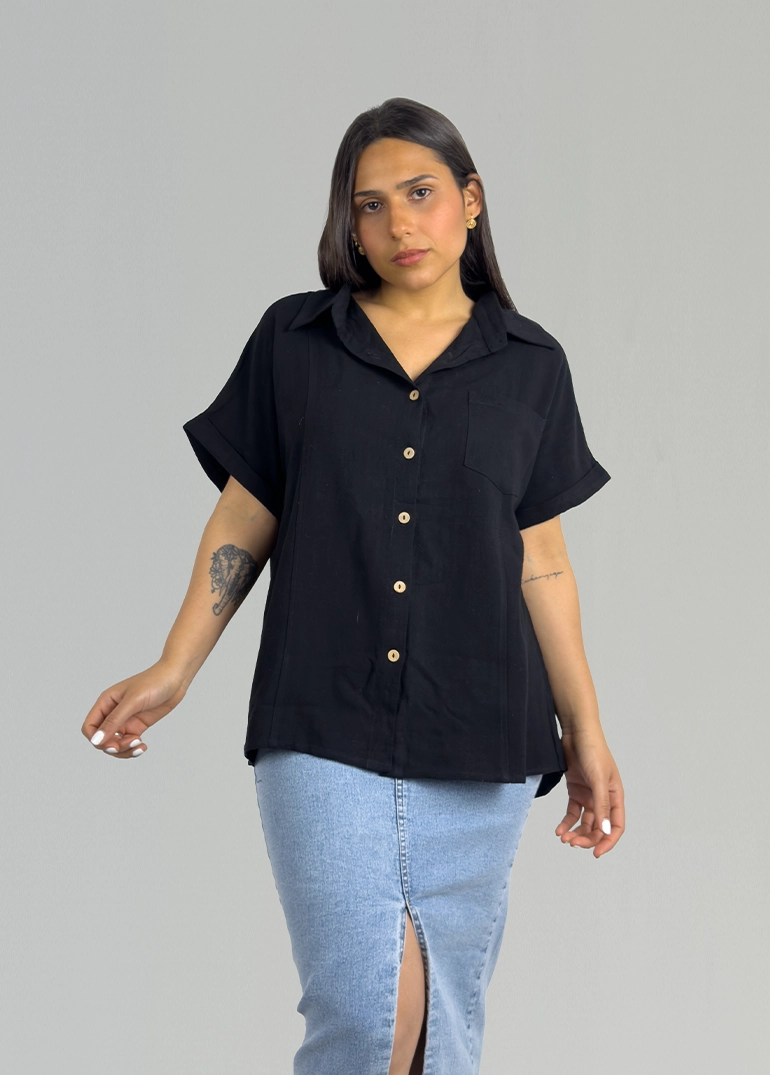 Camisa simil lino, mangas cortas y amplias. Cuello con solapa y botones de madera.