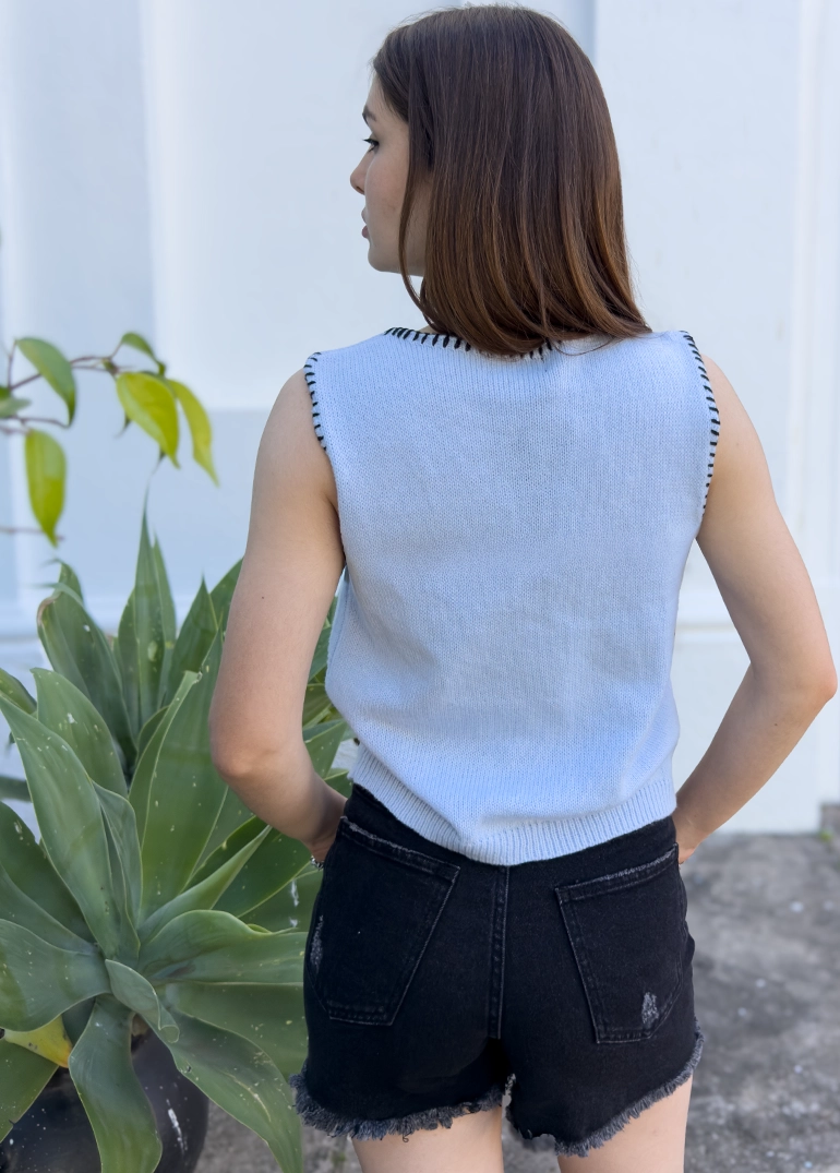 Chaleco simil hilo con pespunte en negro y broches frontales.