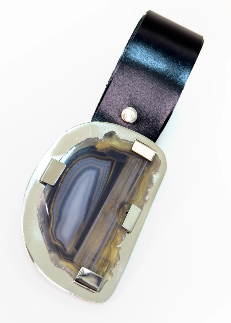Cinto de cuero negro con hebilla de piedra plateada irregular.