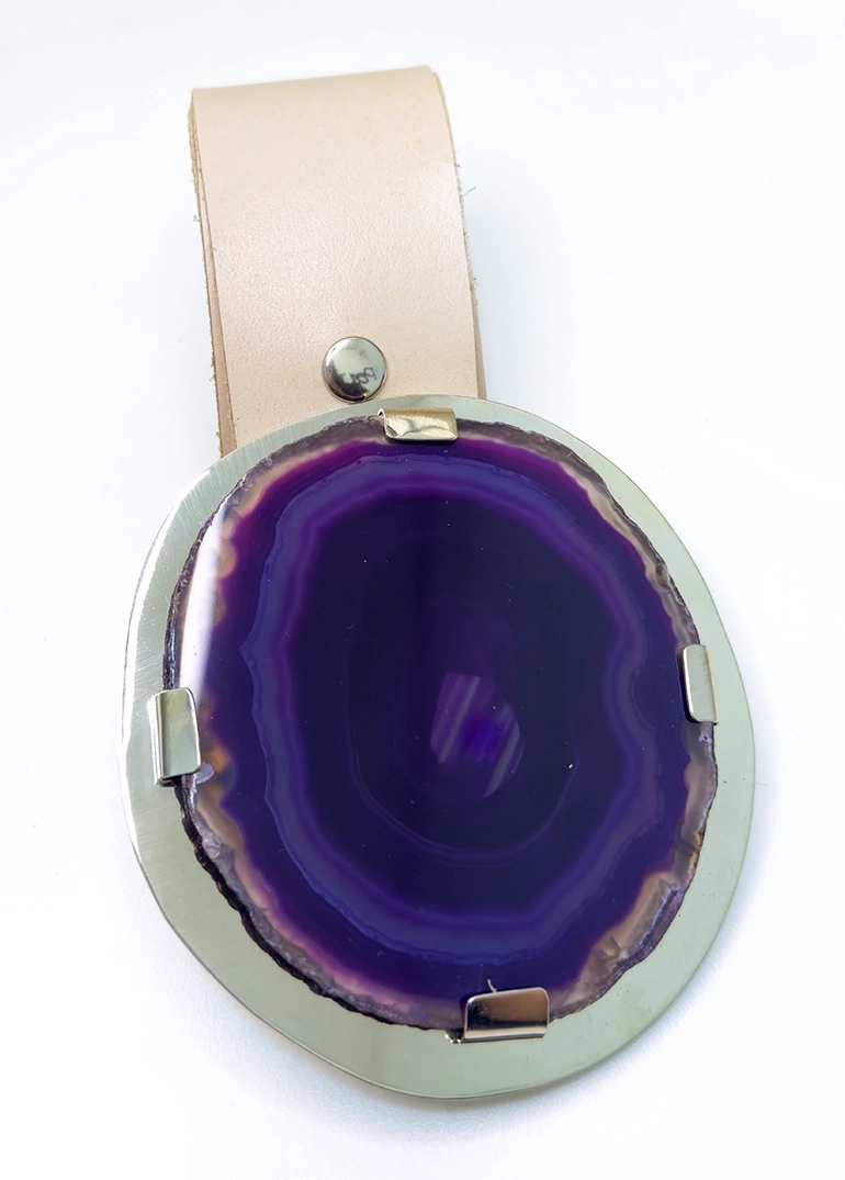 Cinto de cuero natural con hebilla de alpaca plateada circular grande y piedra ágata violeta.