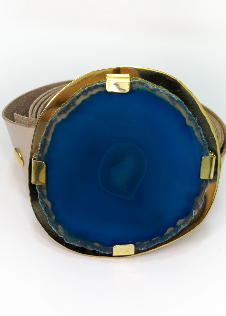 Cinto de cuero natural con hebilla de bronce circular grande y piedra ágata turquesa.