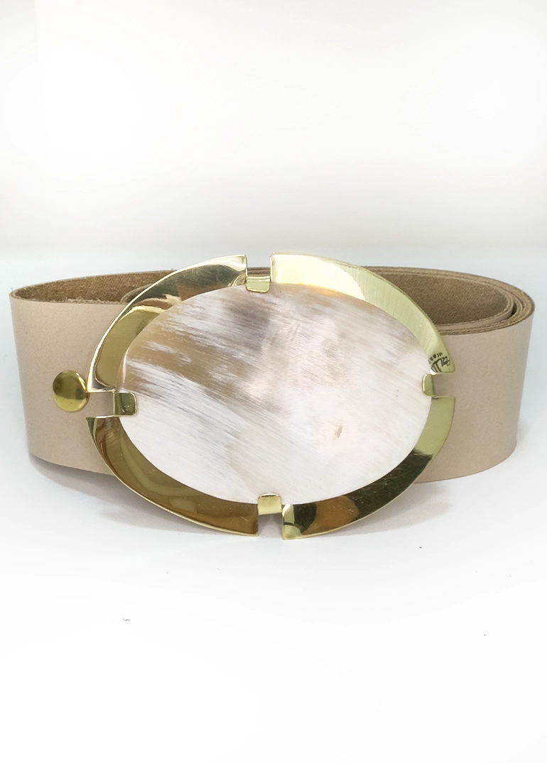 Cinto de cuero natural con hebilla de guampa dorada oval.