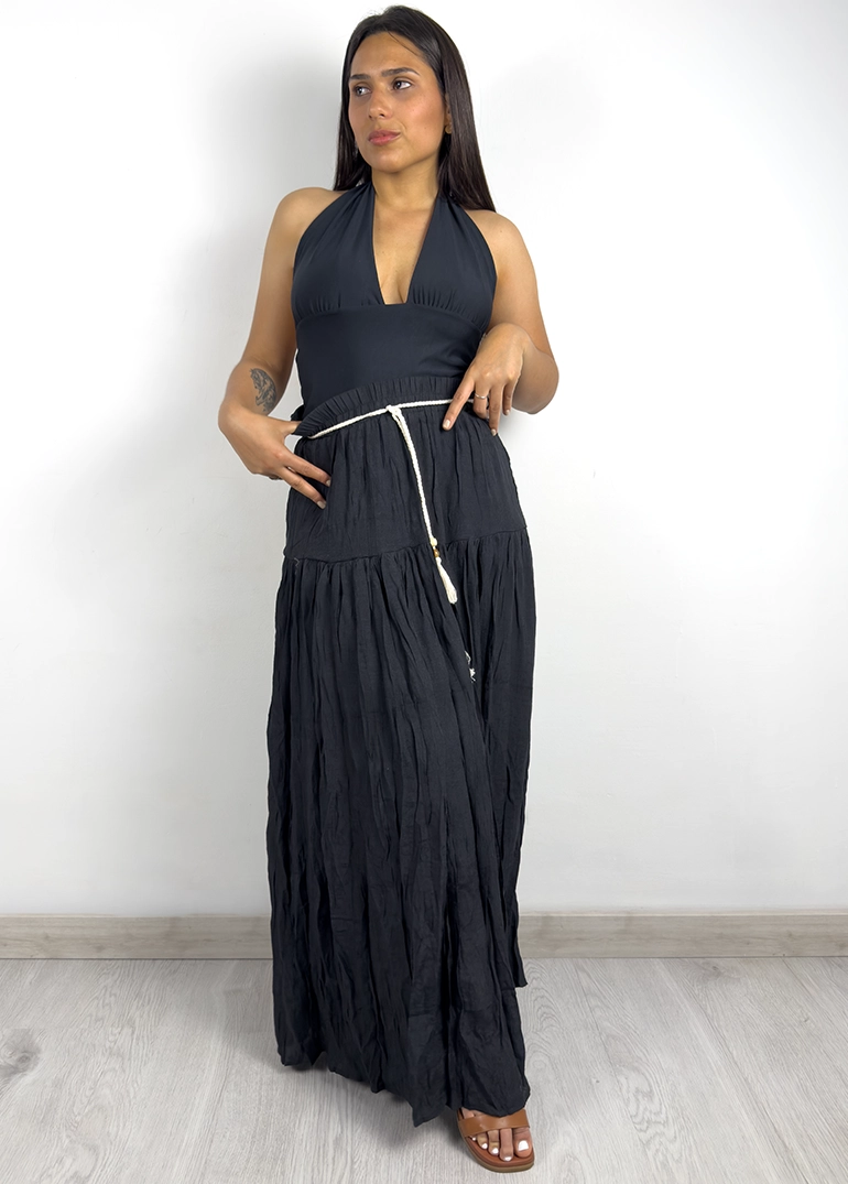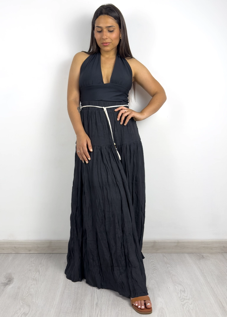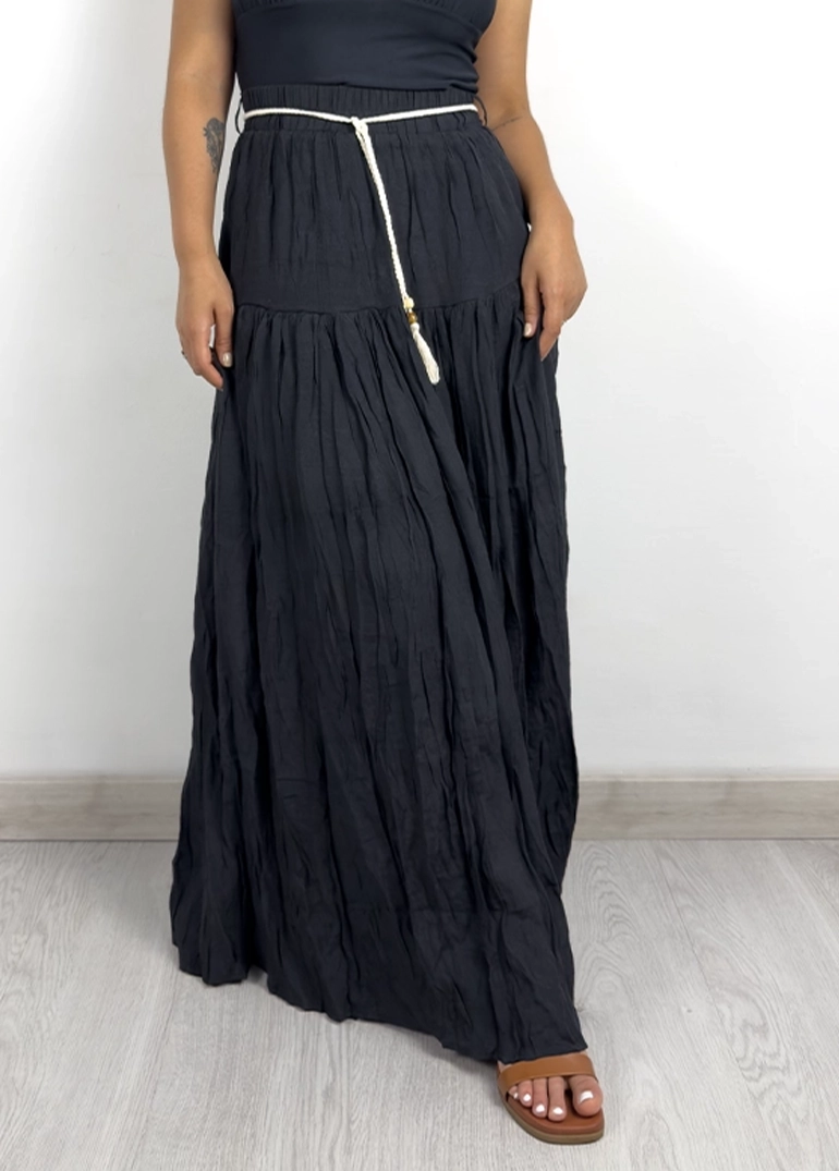 Falda larga fluida con caída. Forro interno corto, cinto incluido.