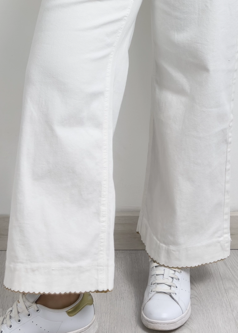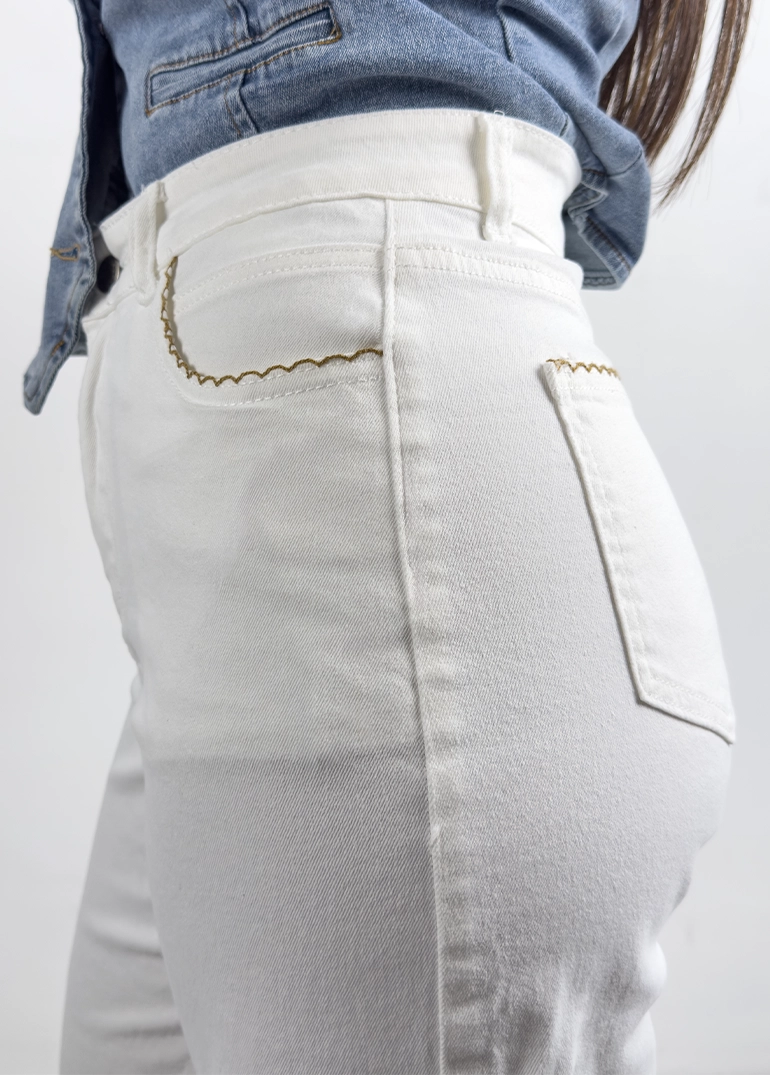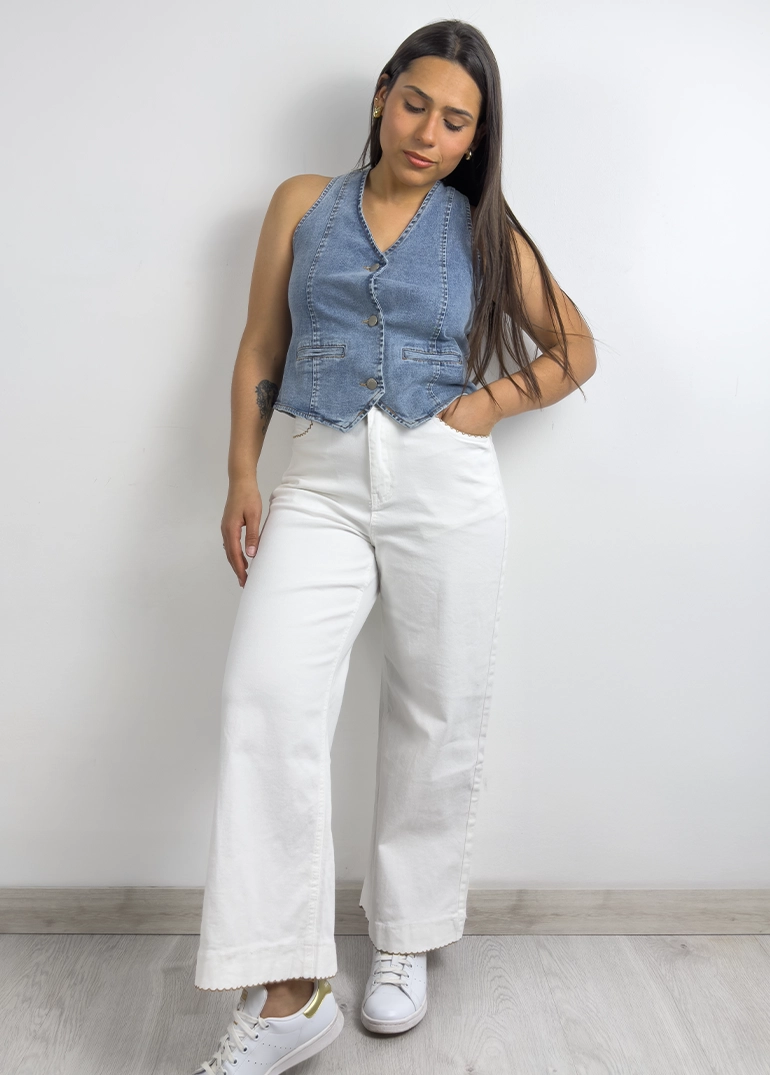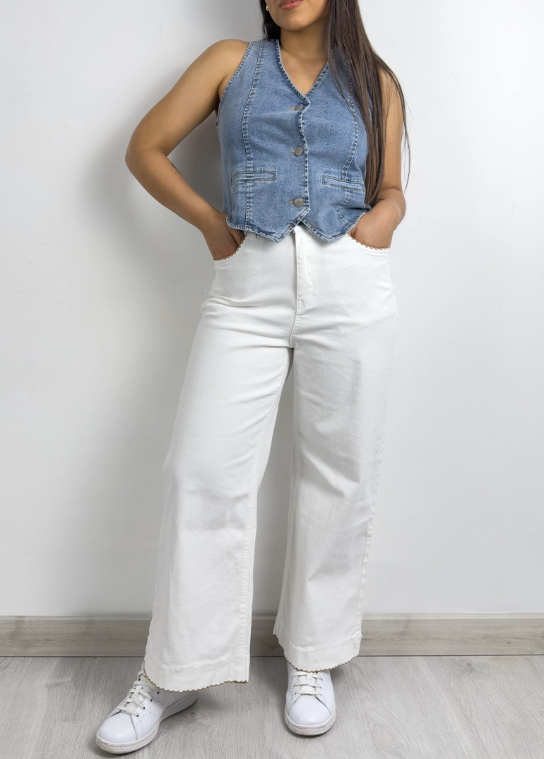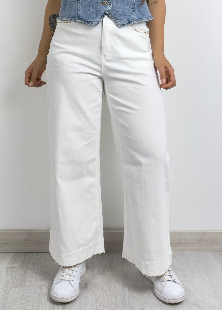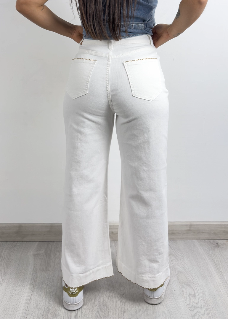 Jean tobillero con bordado en bolsillos y ruedo. Tiro alto, piernas amplias y ruedo amplio.