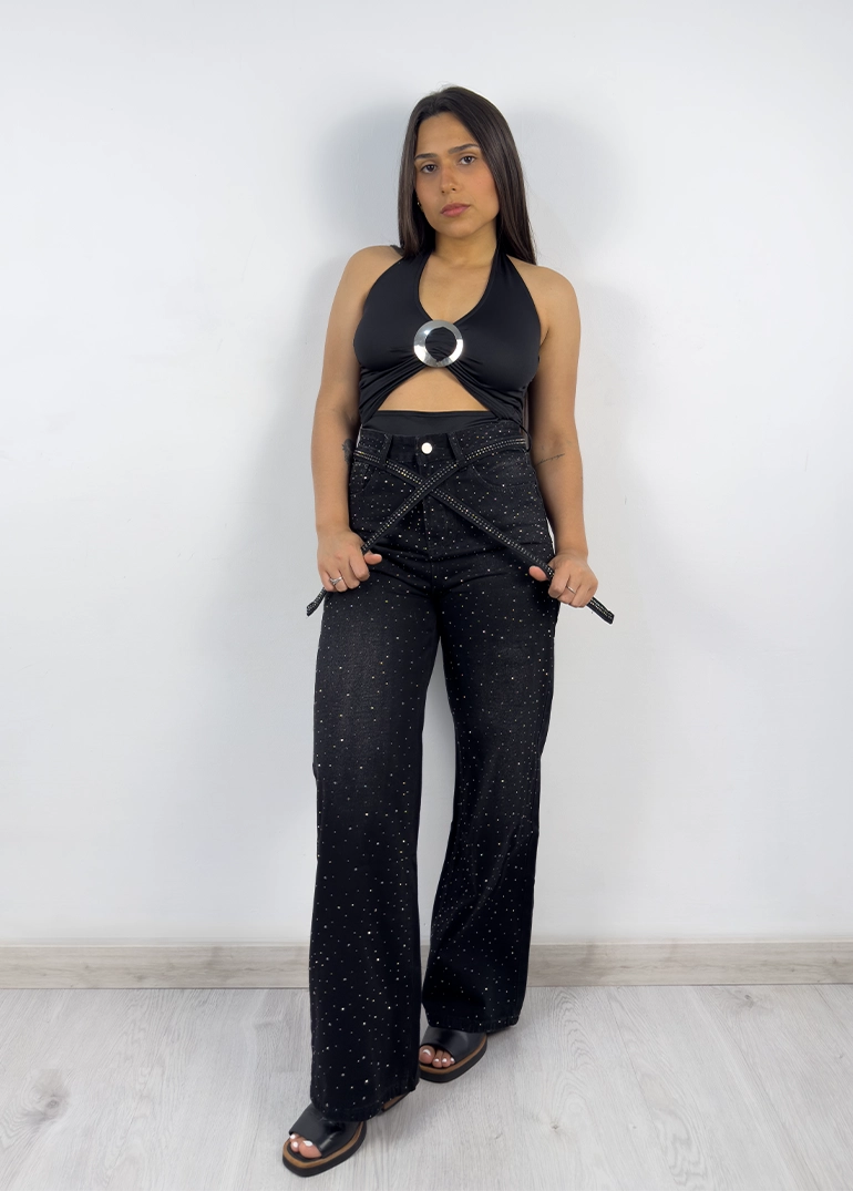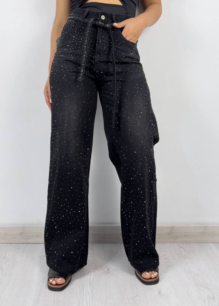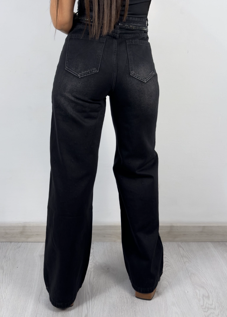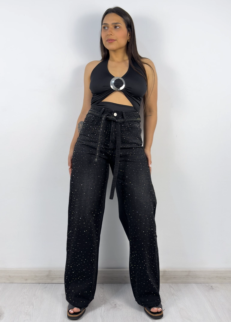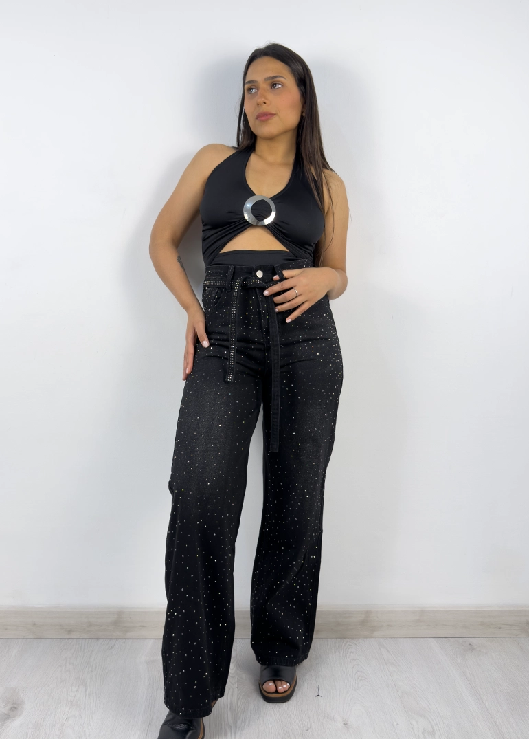 Jean con brillo en cara frontal y cinto. Piernas amplias. Tiro alto, cierre con cremallera metálica. Sin lycra.