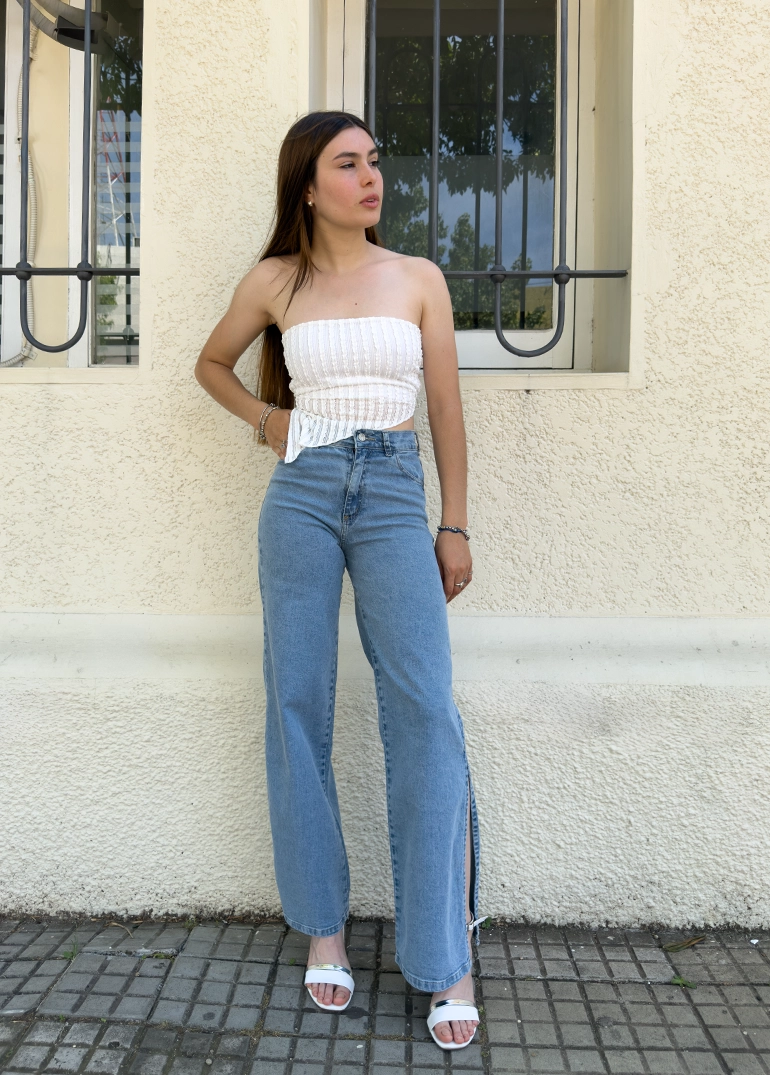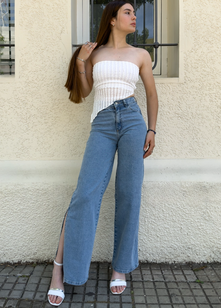 Jean wide leg con tajo lateral. Bolsillos frontales y traseros, con lycra.