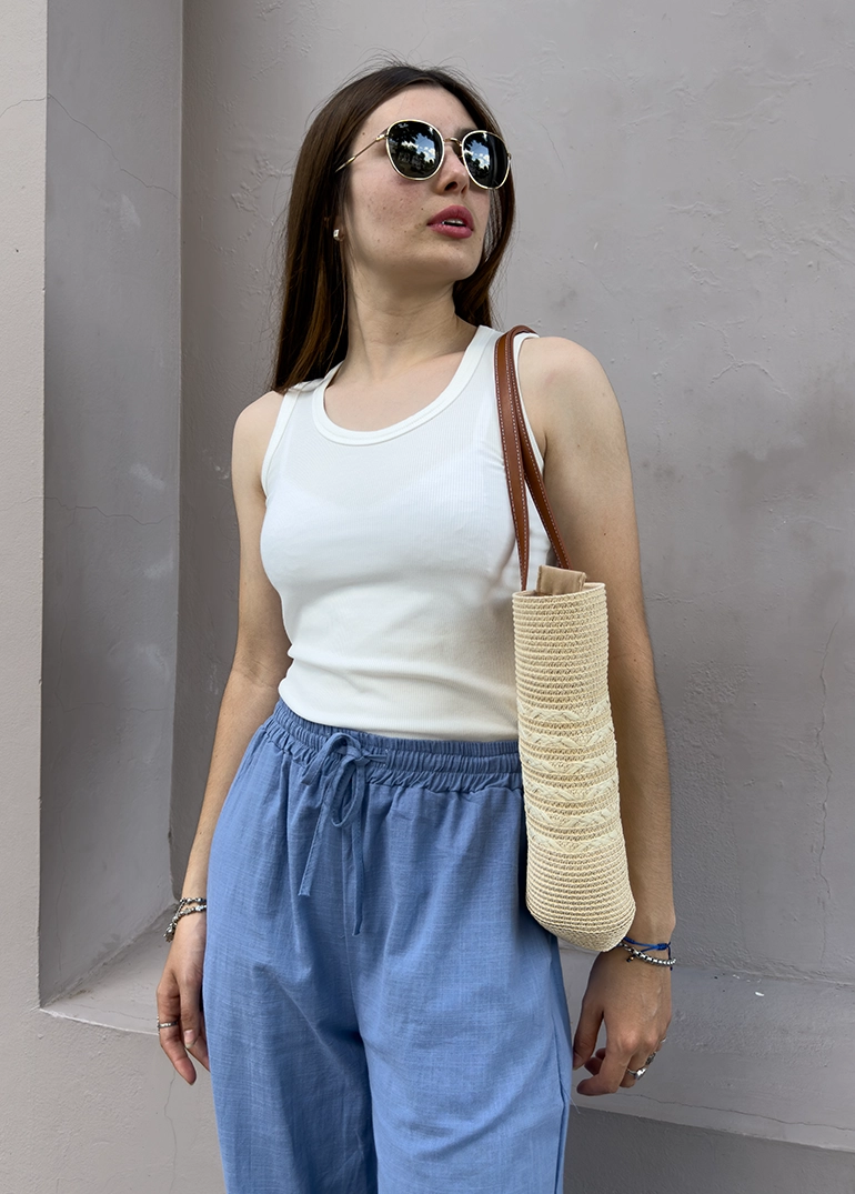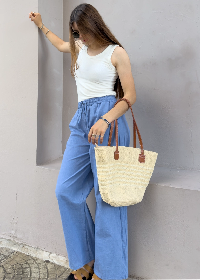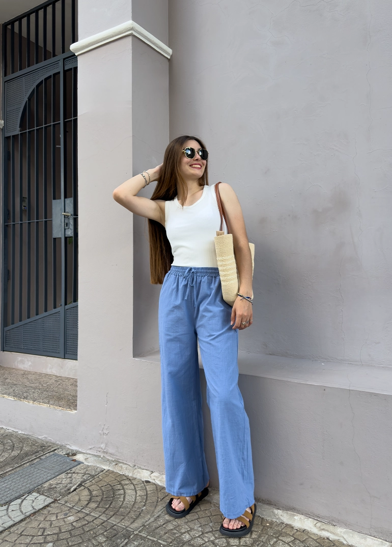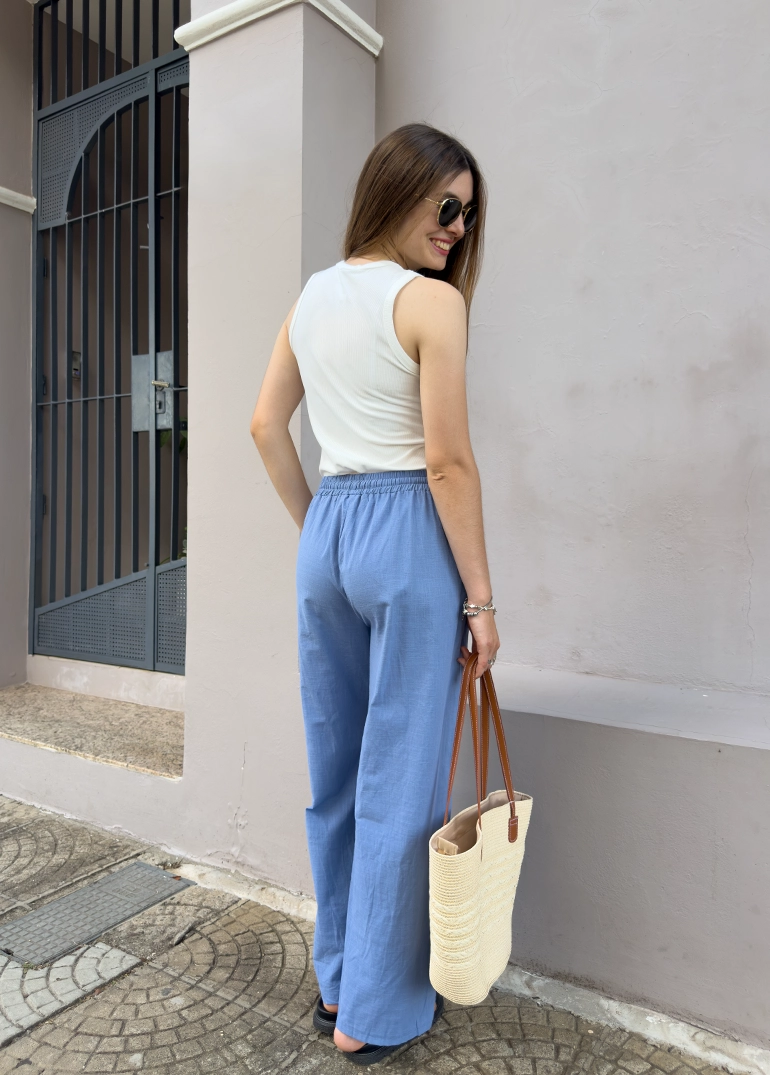 Pantalón simil lino, piernas amplias y cintura elastizada con cordón ajustable. Bolsillos frontales.