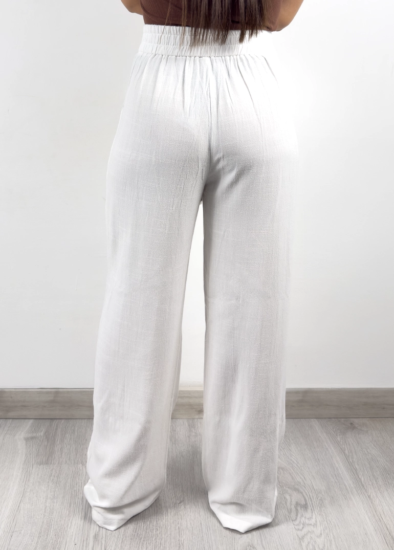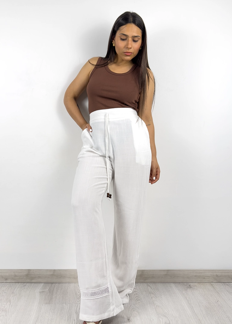 Pant en lino. Bordados tipo crochet en bajo ruedo y bolsillos frontales. Cintura con elástico.