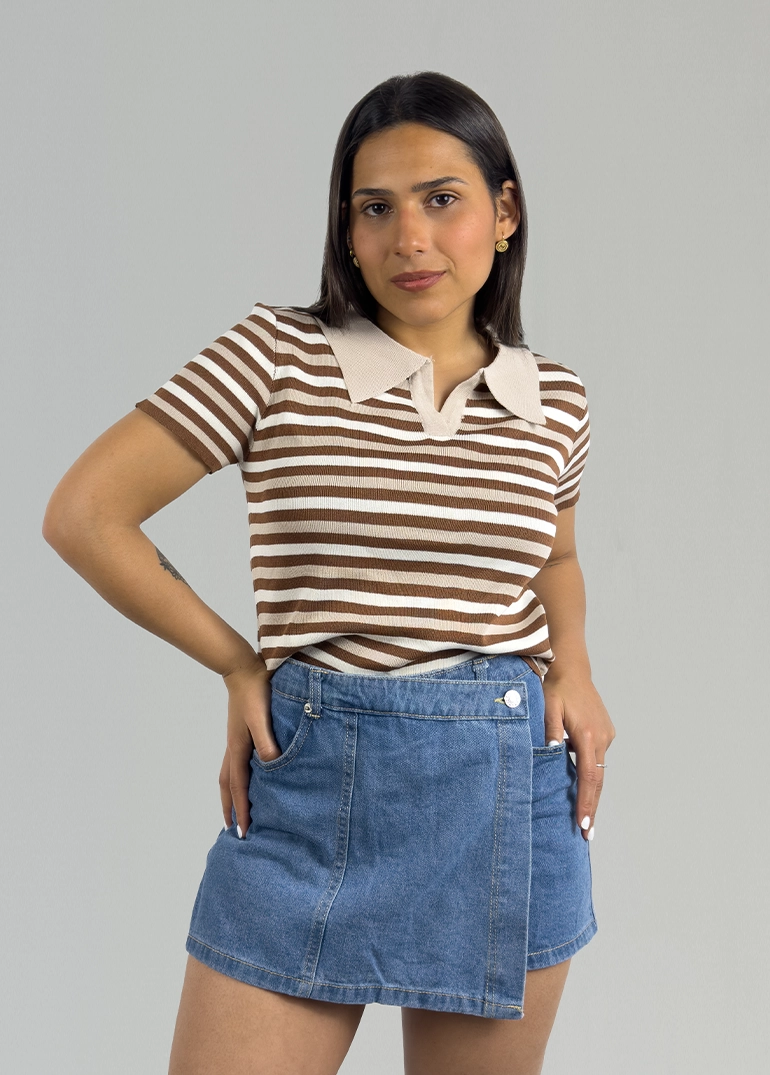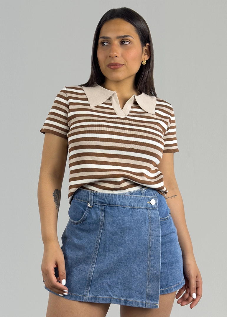 Remera con cuello solapa en hilo. Rayada en colores combinados.