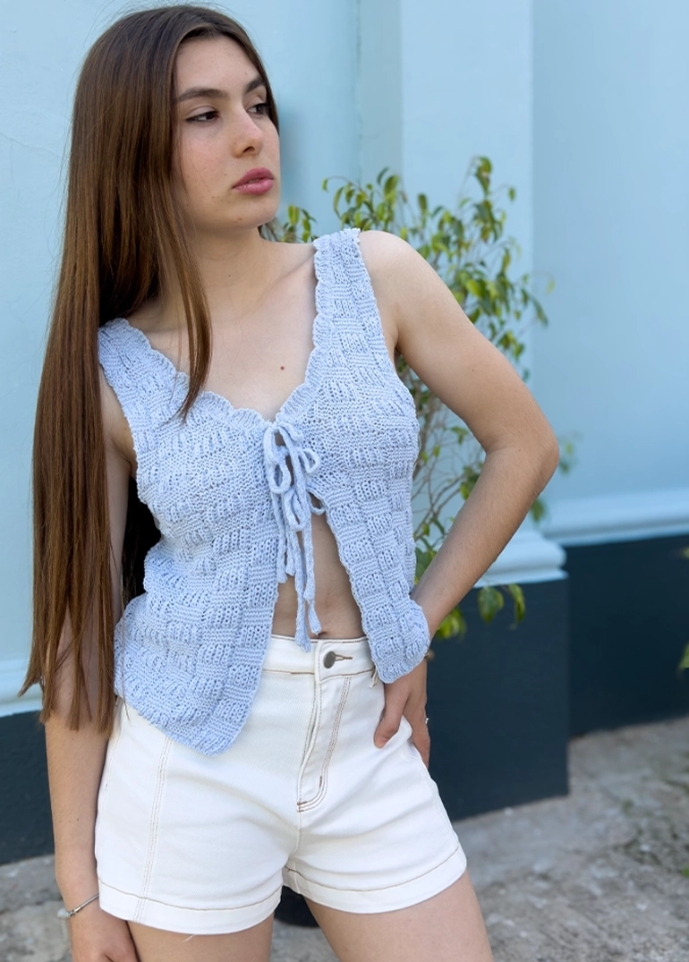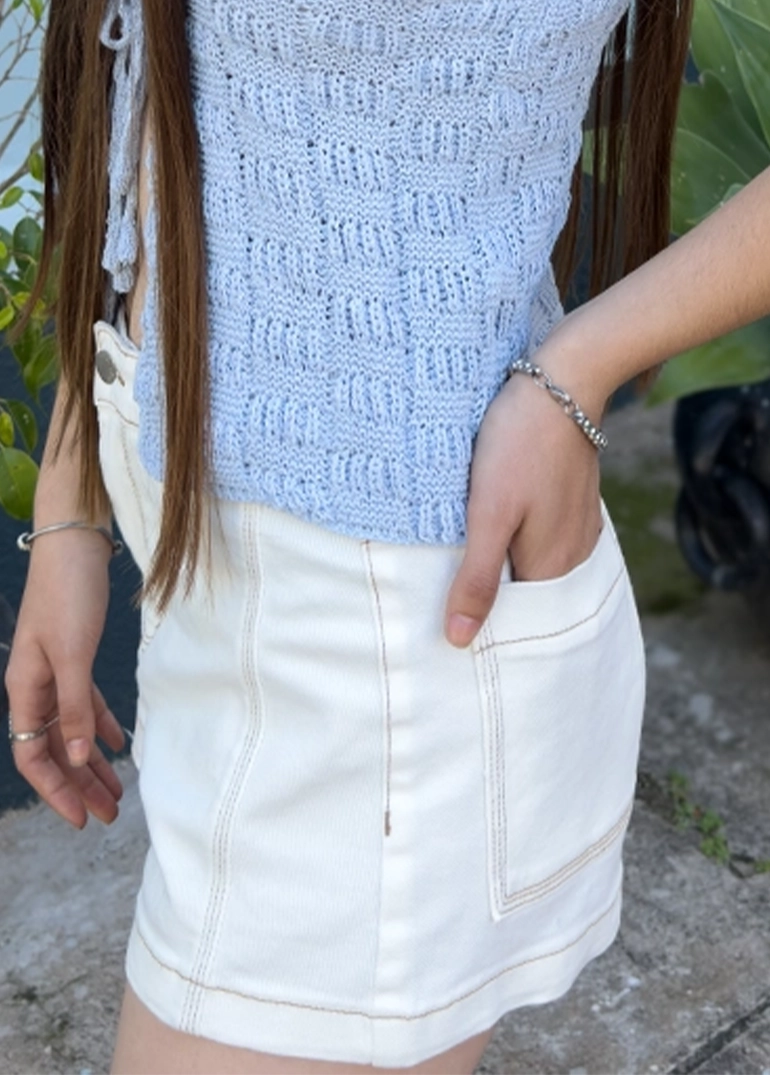 Short jean con lycra y pespunte marrón. Bolsillos y cierre con cremallera metálica.
