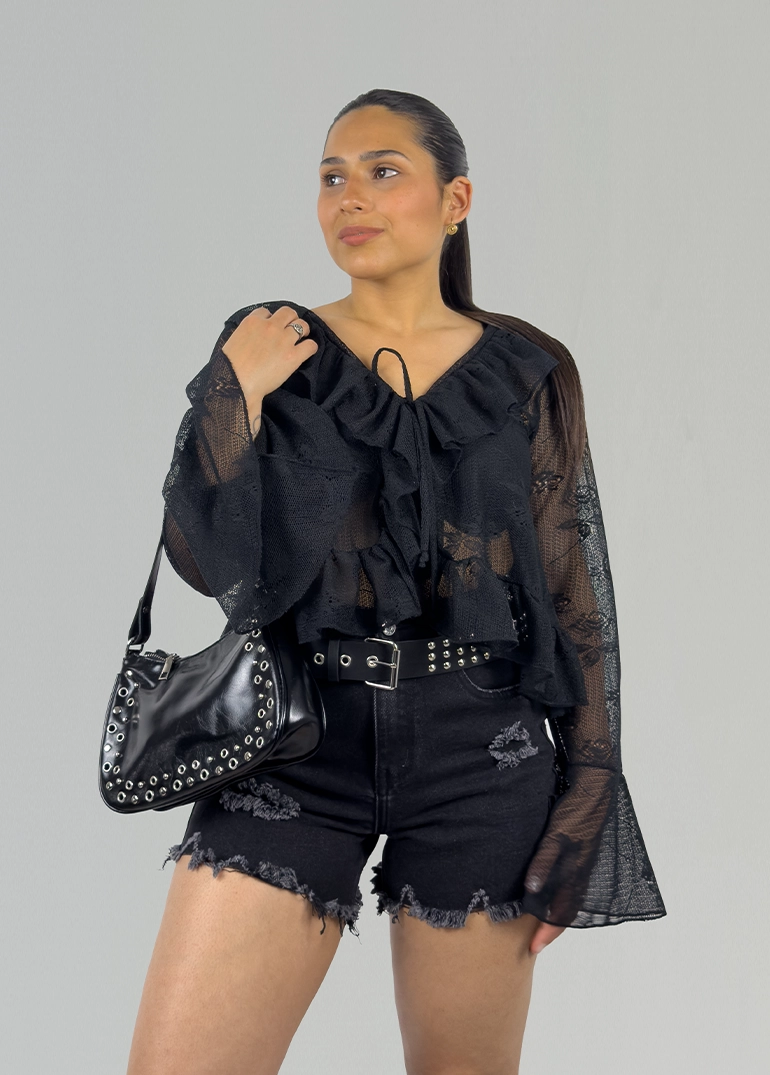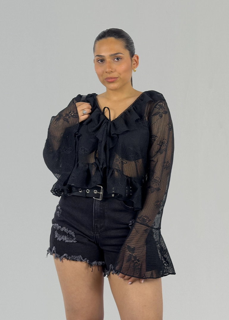 Top de encaje con nudo frontal y volados. Mangas oxford