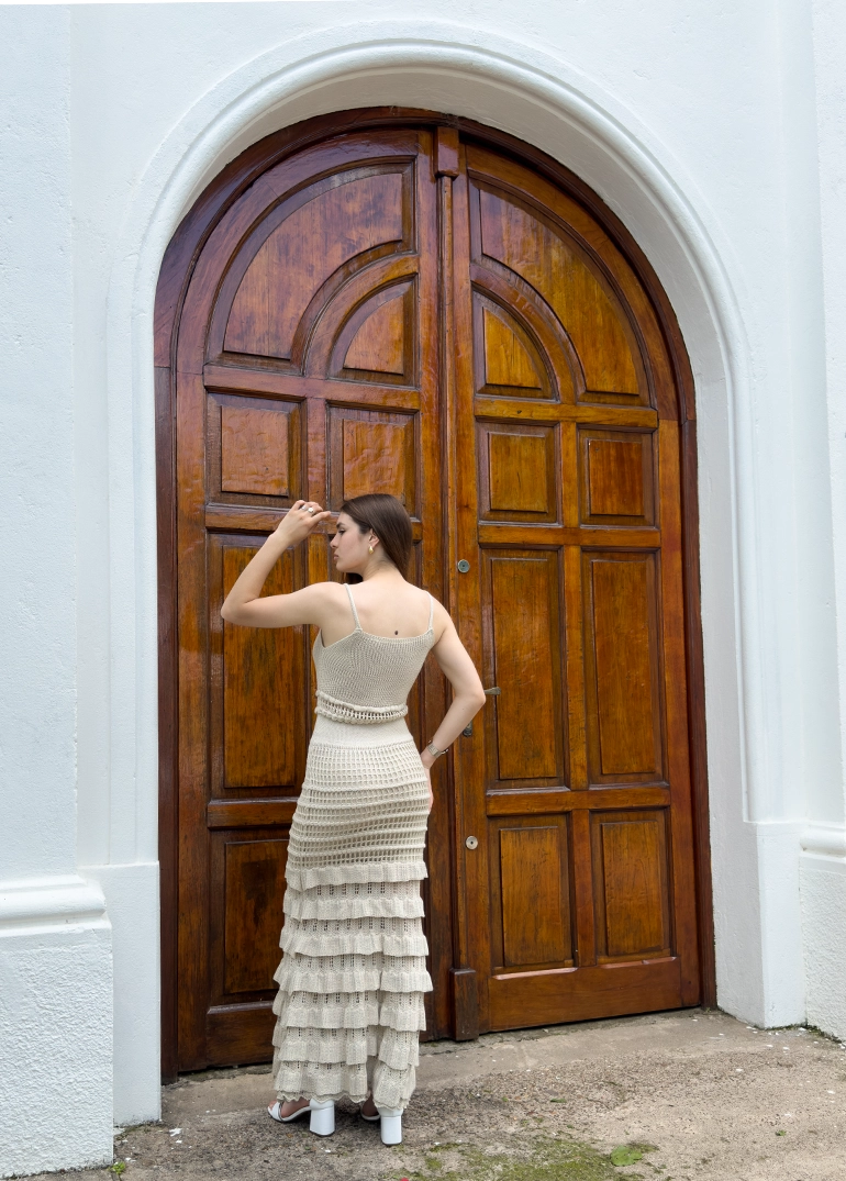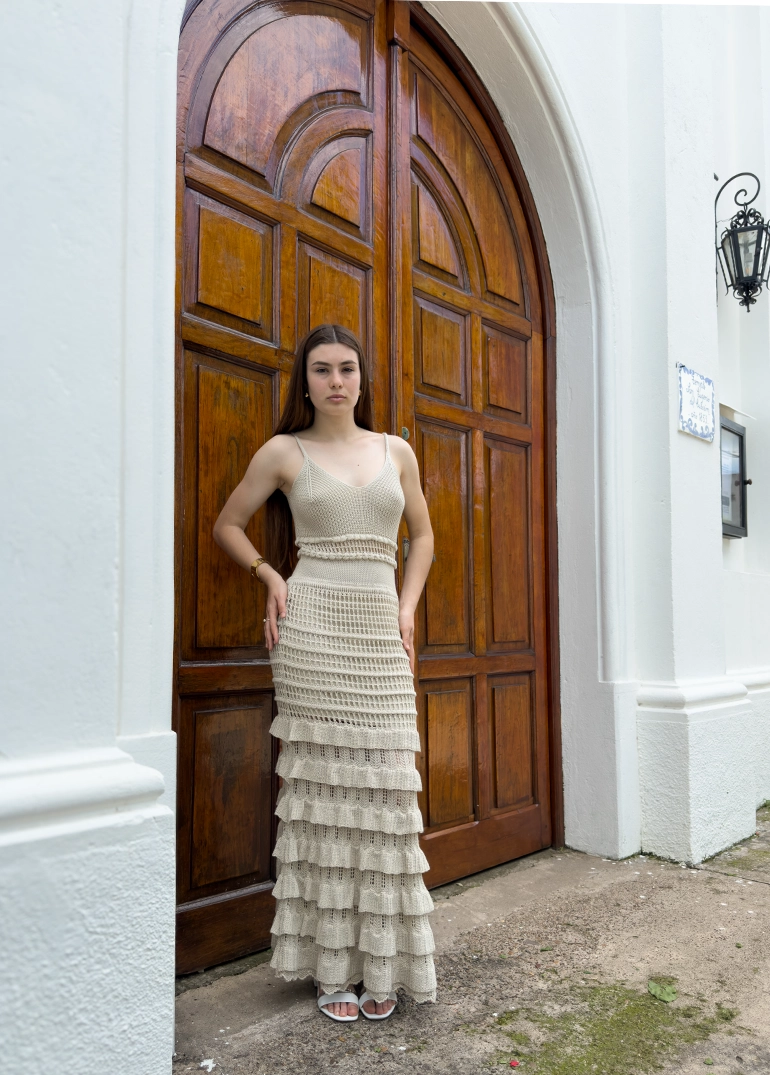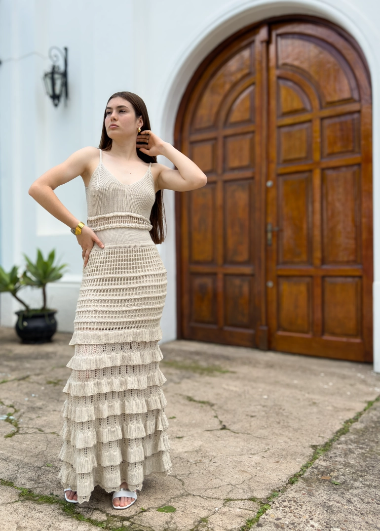 Vestido en crochet con escote pronunciado. Siete capas de volados bajos. Cintura con transparencia y forro interno corto.