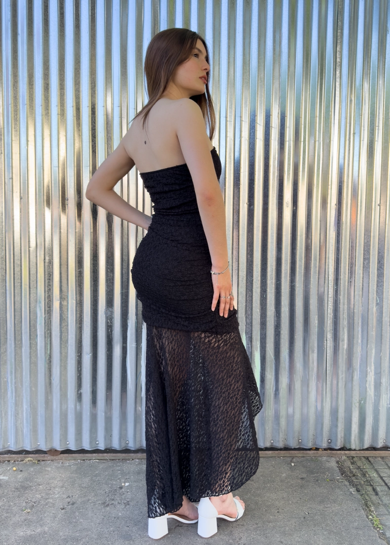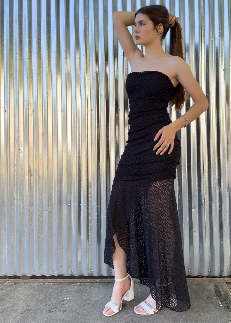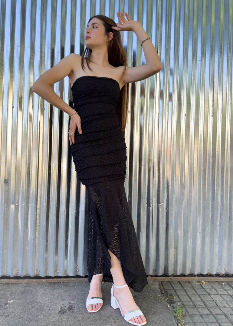 Vestido de encaje stretch al cuerpo con frunce lateral y volado bajo.