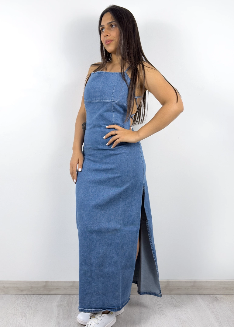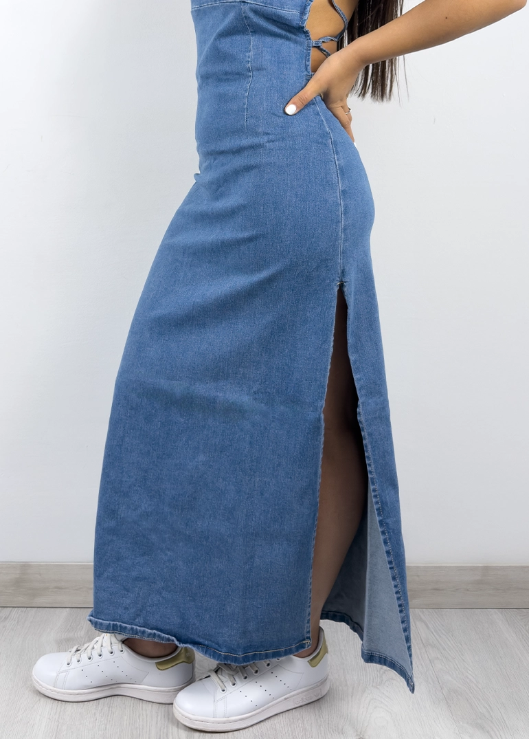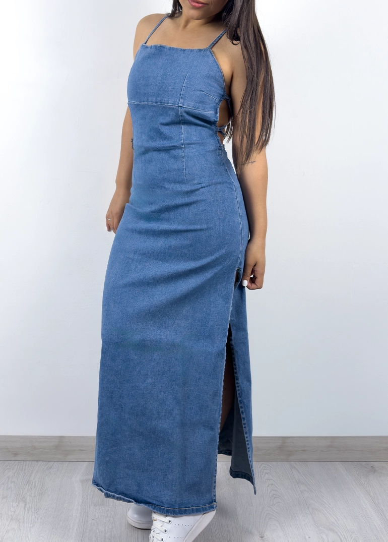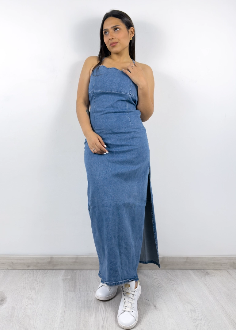 Vestido denim con lycra. Espalda cruzada con cierre y tajo lateral. Largo Midi.